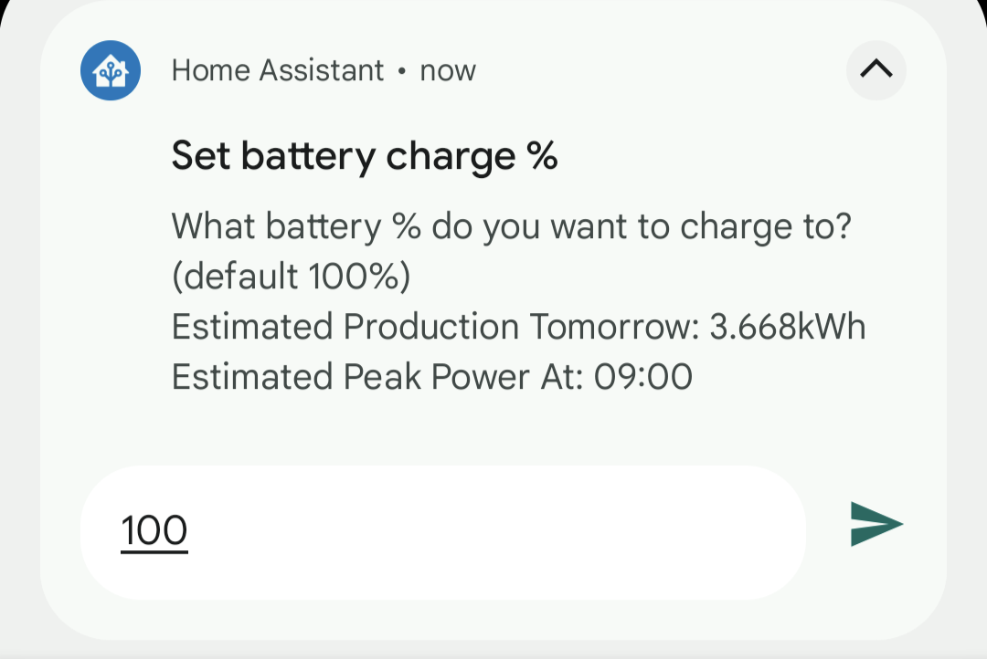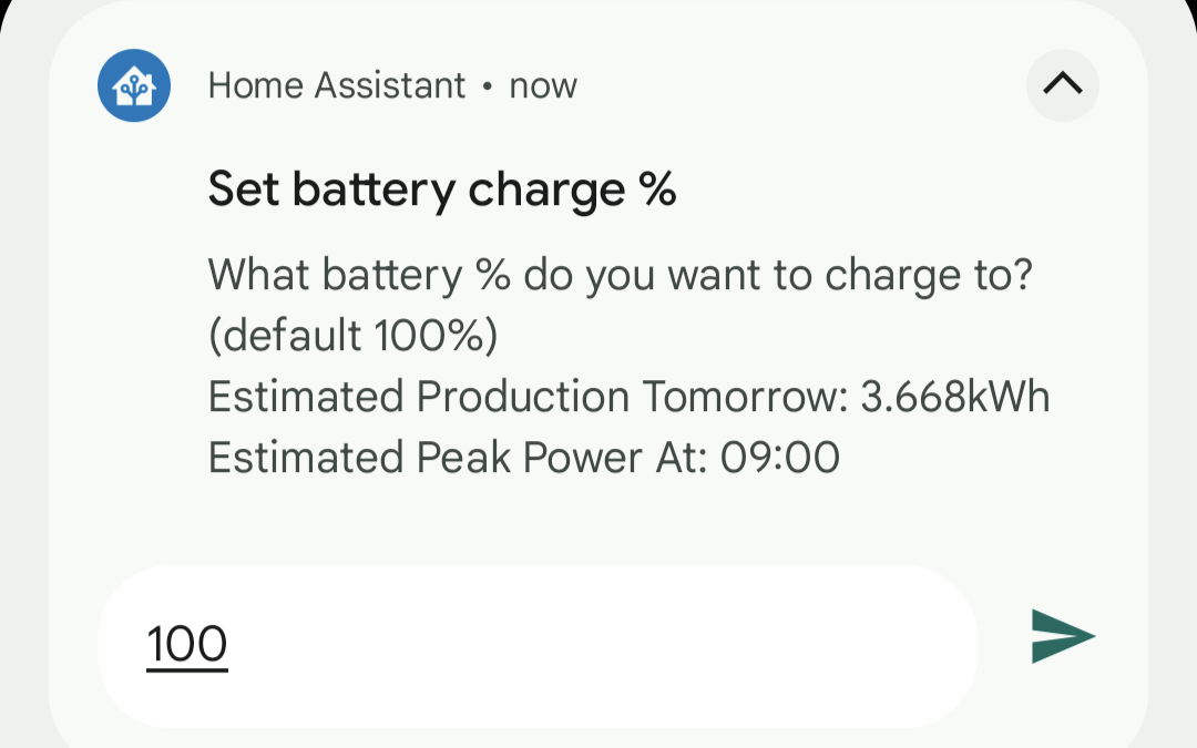 The notification contains the predicted PV generation as well as the time of peak PV power for tomorrow, from the forecast.solar integration. This was intended to allow me to pick a suitable amount of charge, but the forecast isn’t proving very accurate so far, more tweaking required. Instead, I just check the weather forecast on my phone.